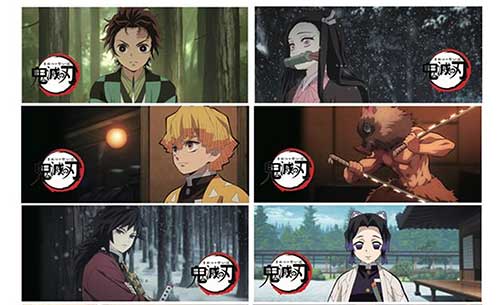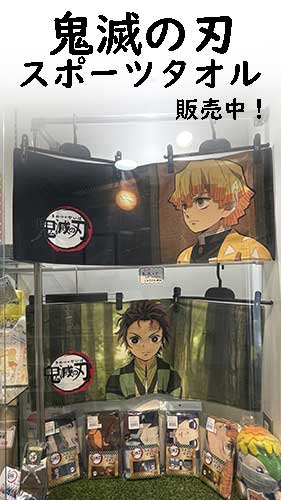 館内入ってすぐのガラスケースに飾ってある、鬼滅の刃 アニメシーンタオル。