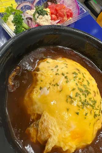 このオムライスの中のごはん、白いご飯ではなく…にんじんのピラフでしょうか。