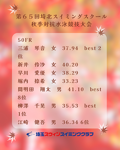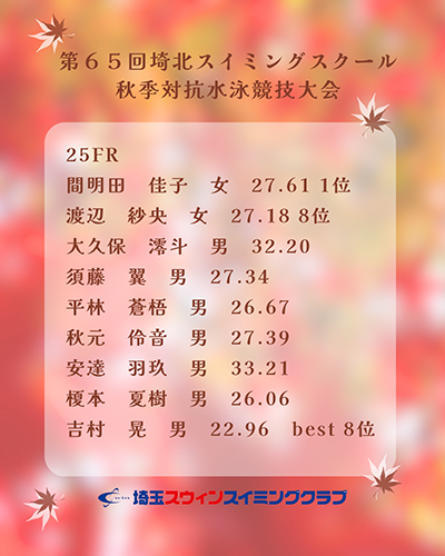 第65回埼北スイミングスクール秋季対抗水泳競技大会クラブ結果その1