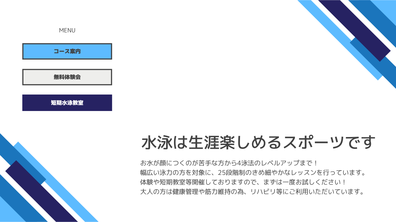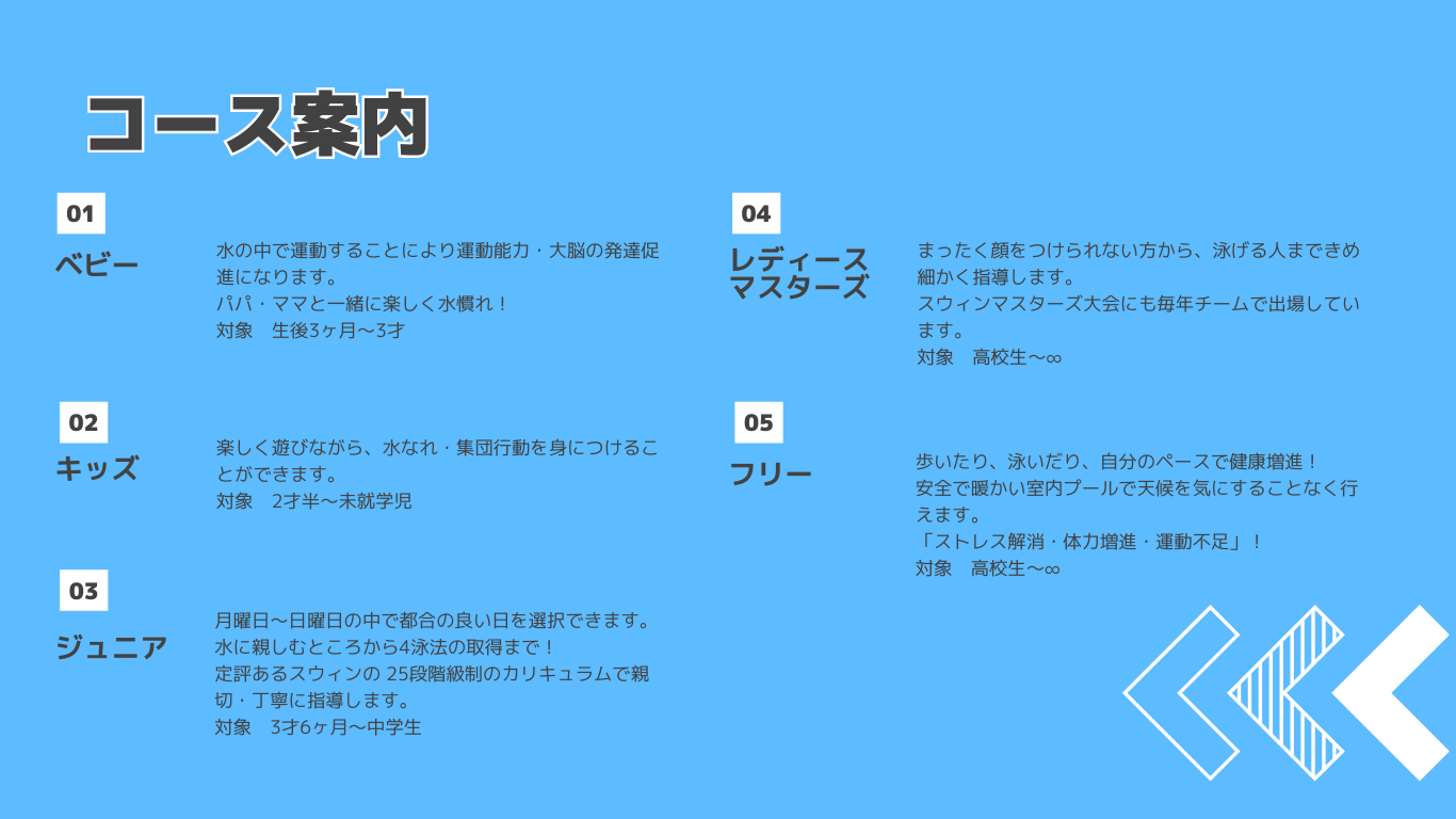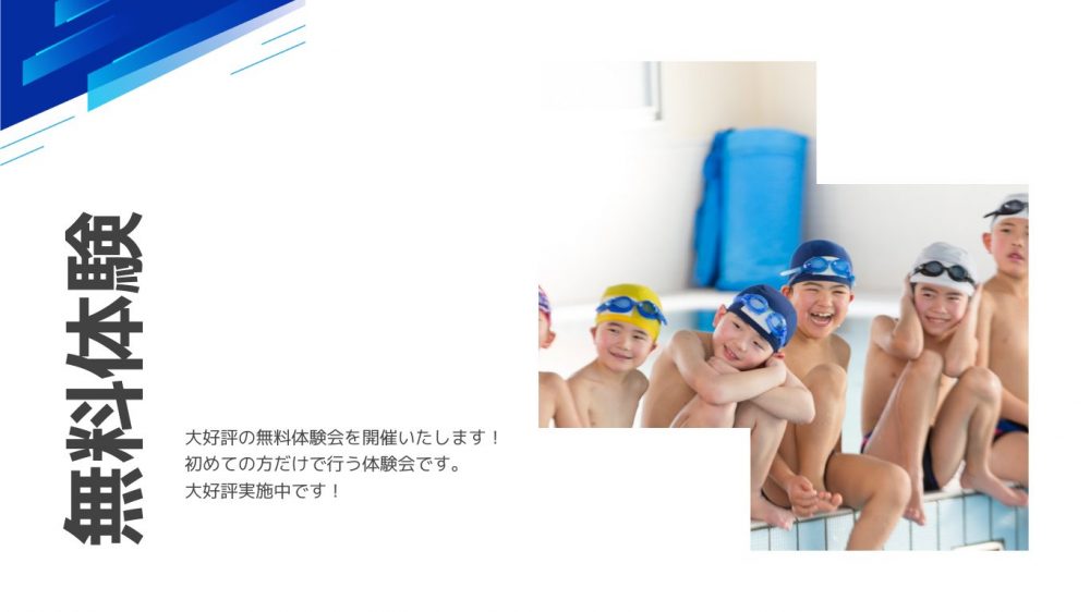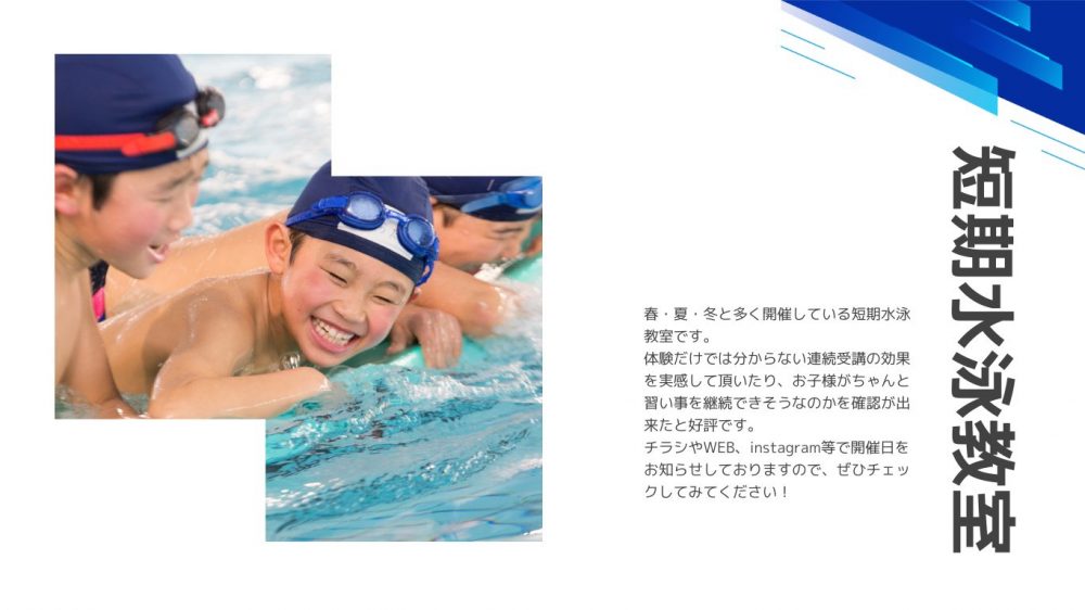 2025年夏へ向けて! 2025年1月24日 最終更新日時 : 2025年2月25日 クラブフロント フリーコースを体験する 指導付きコースを体験する 無料体験会を予約 通常体験を予約 無料体験週間を予約 無料体験会を予約 短期水泳教室を予約・詳細を確認する