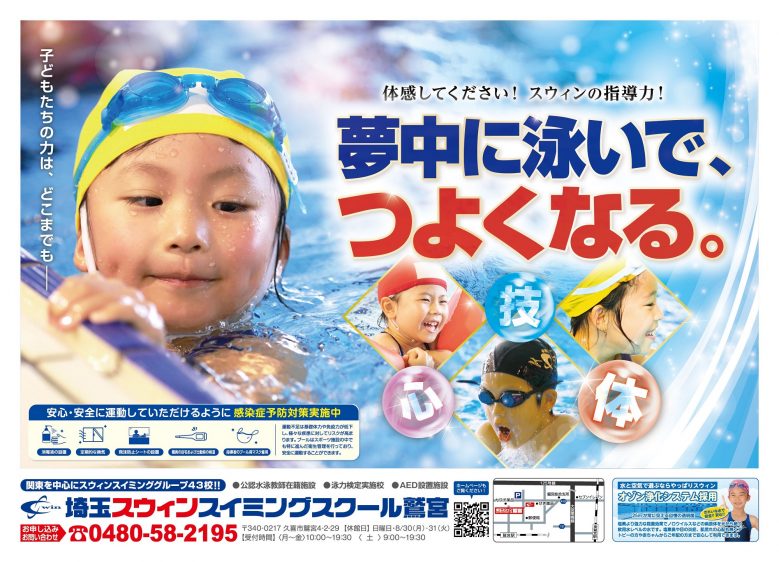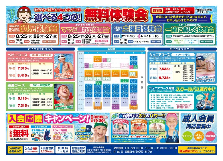 夢中で泳いで強くなる!キャンペーン実施中! 2021年8月20日 最終更新日時 : 2021年8月20日 コーチ鷲宮 夢中で泳いで、強くなる! キャンペーン実施中! 【キャンペーン内容】 もれなく全員 入会金無料!!<通常6,600円(税込み)> お子さまには 水泳用品一式プレゼント!!帽子・水着・スクールバッグ・タオル入れ! 大人・ベビーの方には スウィン商品券プレゼント!!水着等スクールでのお買い物に! 【期間】 9月18日(土)19:30まで