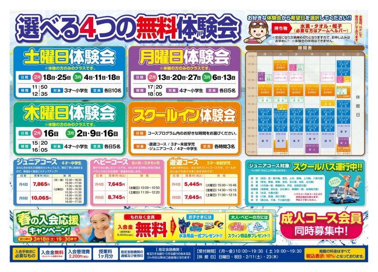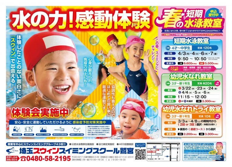 春の入会応援キャンペーン 2023年2月8日 最終更新日時 : 2023年2月8日 コーチ鷲宮 ご興味のある方は是非!選べる体験会実施中! 短期水泳教室のお申込みはこちらから! 【キャンペーン内容】 もれなく全員入会金無料!!<通常6,600円(税込み)>お子さまには水泳用品一式プレゼント!!帽子・水着・スクールバッグ・タオル入れ!大人・ベビーの方にはスウィン商品券プレゼント!!水着等スクールでのお買い物に! 【期間】 3/18(土) 19:30 まで