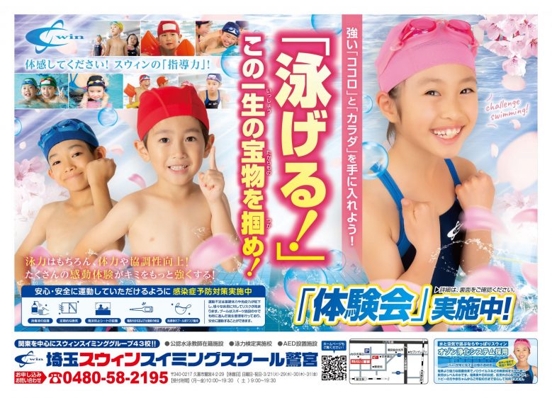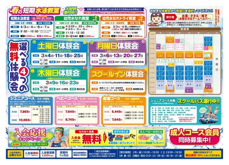 🌸春の入会応援キャンペーン🌸 2023年3月2日 最終更新日時 : 2023年3月2日 コーチ鷲宮 ご興味のある方は是非!選べる体験会実施中! 短期水泳教室のお申込みはこちらから! 【キャンペーン内容】 もれなく全員入会金無料!!<通常6,600円(税込み)>お子さまには水泳用品一式プレゼント!!帽子・水着・スクールバッグ・タオル入れ!大人・ベビーの方にはスウィン商品券プレゼント!!水着等スクールでのお買い物に! 【期間】 3/28(火) 19:30 まで