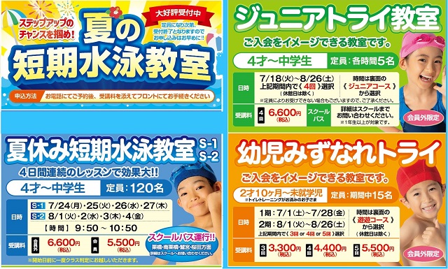 下記要項にて、夏の短期水泳教室・ジュニア水慣れトライ教室を実施いたします。