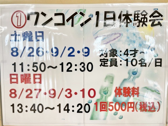 皆様こんにちは!まだまだ暑い日が続いていますが、いかがお過ごしでしょうか。こんなに暑いと海やプールへ行きたくなりますね😊 そんな皆様へワンコイン体験会のお知らせです! 申込:こちらをクリック 【8月】日時:8/27(日) […]