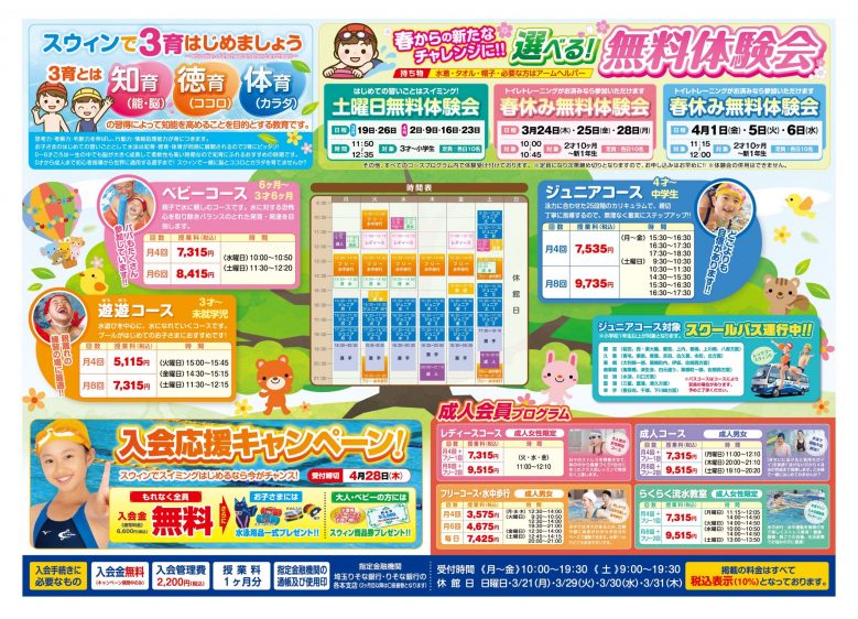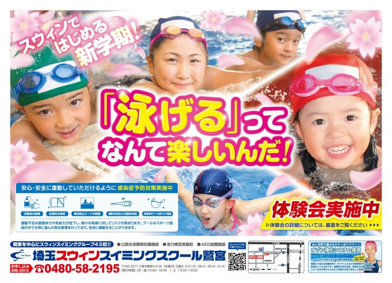 春の入会応援キャンペーン 2022年3月16日 最終更新日時 : 2022年3月17日 コーチ鷲宮 春の入会応援キャンペーン実施中! ご興味のある方はこの機会に是非!体験会も随時募集中! 【キャンペーン内容】 もれなく全員 入会金無料!!<通常6,600円(税込み)> お子さまには 水泳用品一式プレゼント!!帽子・水着・スクールバッグ・タオル入れ! 大人・ベビーの方には スウィン商品券プレゼント!!水着等スクールでのお買い物に! 【期間】 4月28日(土)19:30まで