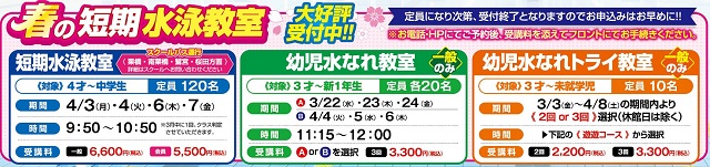 下記要項にて、春の短期水泳教室・水慣れトライ教室を実施いたします。