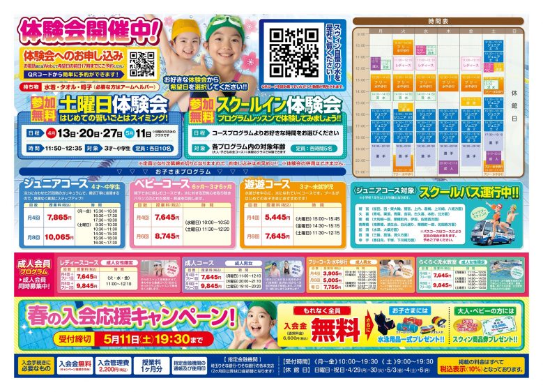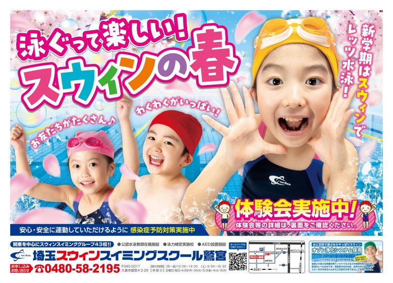 スウィンの春🌸入会キャンペーン🌸 2024年4月10日 最終更新日時 : 2024年4月12日 コーチ鷲宮 選べる体験会実施中!詳しくはこちらからどうぞ! 体験申込フォームはこちらから 【キャンペーン内容】 もれなく全員入会金無料!!<通常6,600円(税込み)> お子さまには水泳用品一式プレゼント!!帽子・水着・スクールバッグ・タオル入れ! 大人・ベビーの方にはスウィン商品券プレゼント!!水着等スクールでのお買い物に! 【期間】 5/11(土) 19:30 まで
