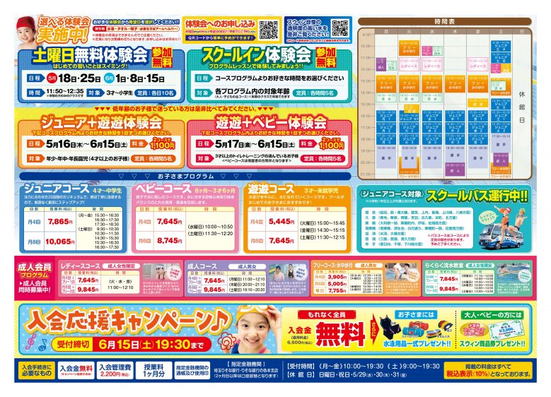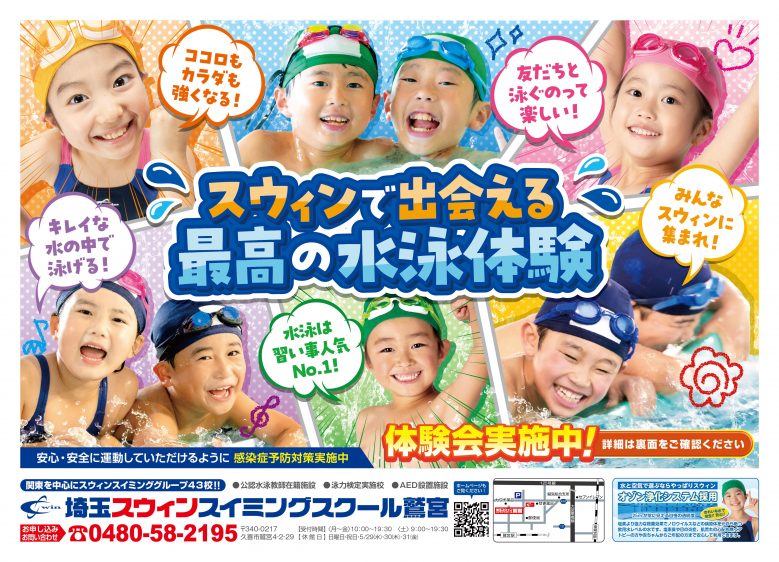 最高の水泳体験キャンペーン! 2024年5月15日 最終更新日時 : 2024年5月28日 コーチ鷲宮 選べる体験会実施中!詳しくはこちらからどうぞ! 体験申込フォームはこちらから 【キャンペーン内容】 もれなく全員入会金無料!!<通常6,600円(税込み)> お子さまには水泳用品一式プレゼント!!帽子・水着・スクールバッグ・タオル入れ! 大人・ベビーの方にはスウィン商品券プレゼント!!水着等スクールでのお買い物に! 【期間】 6/15(土) 19:30 まで