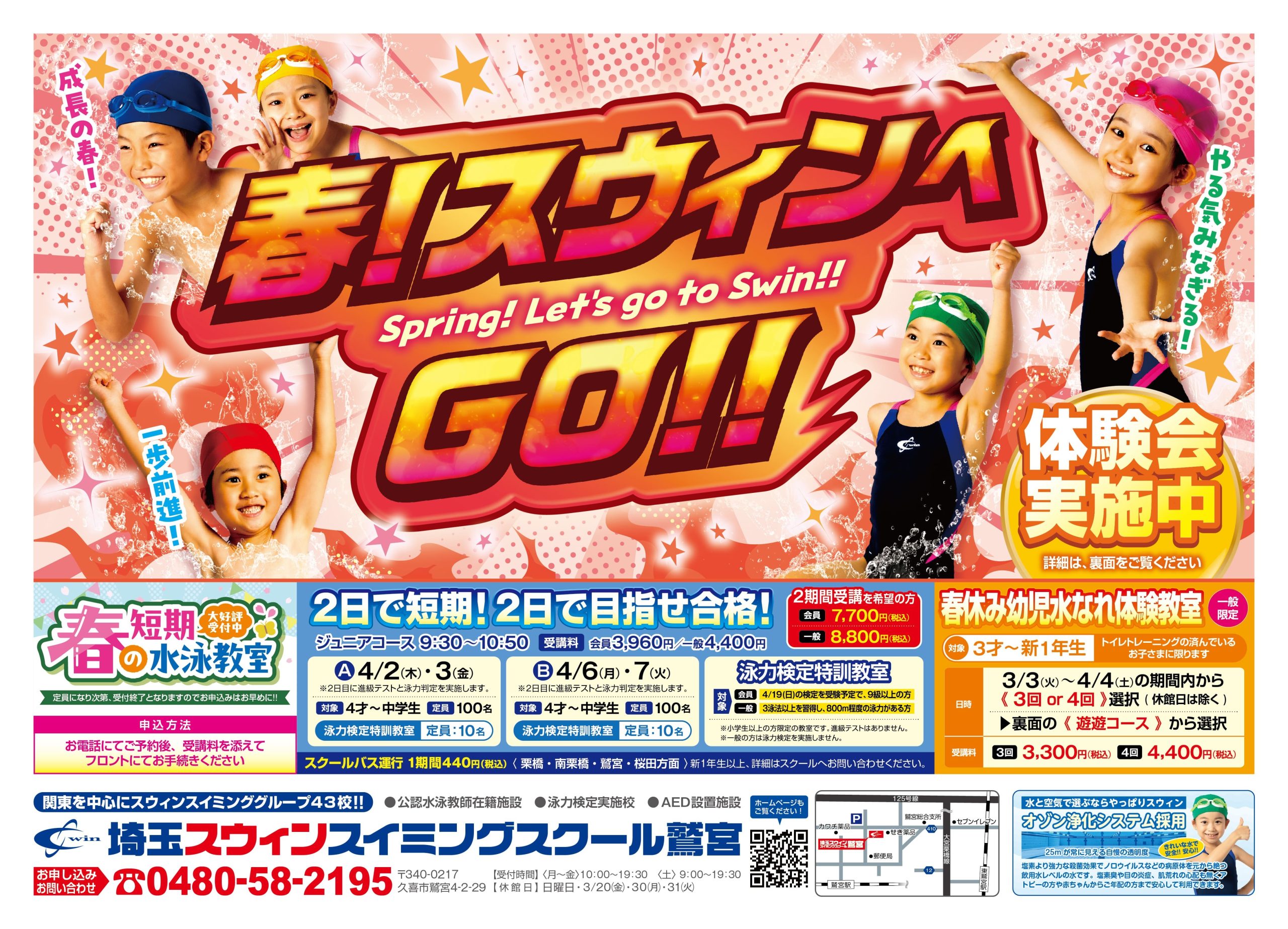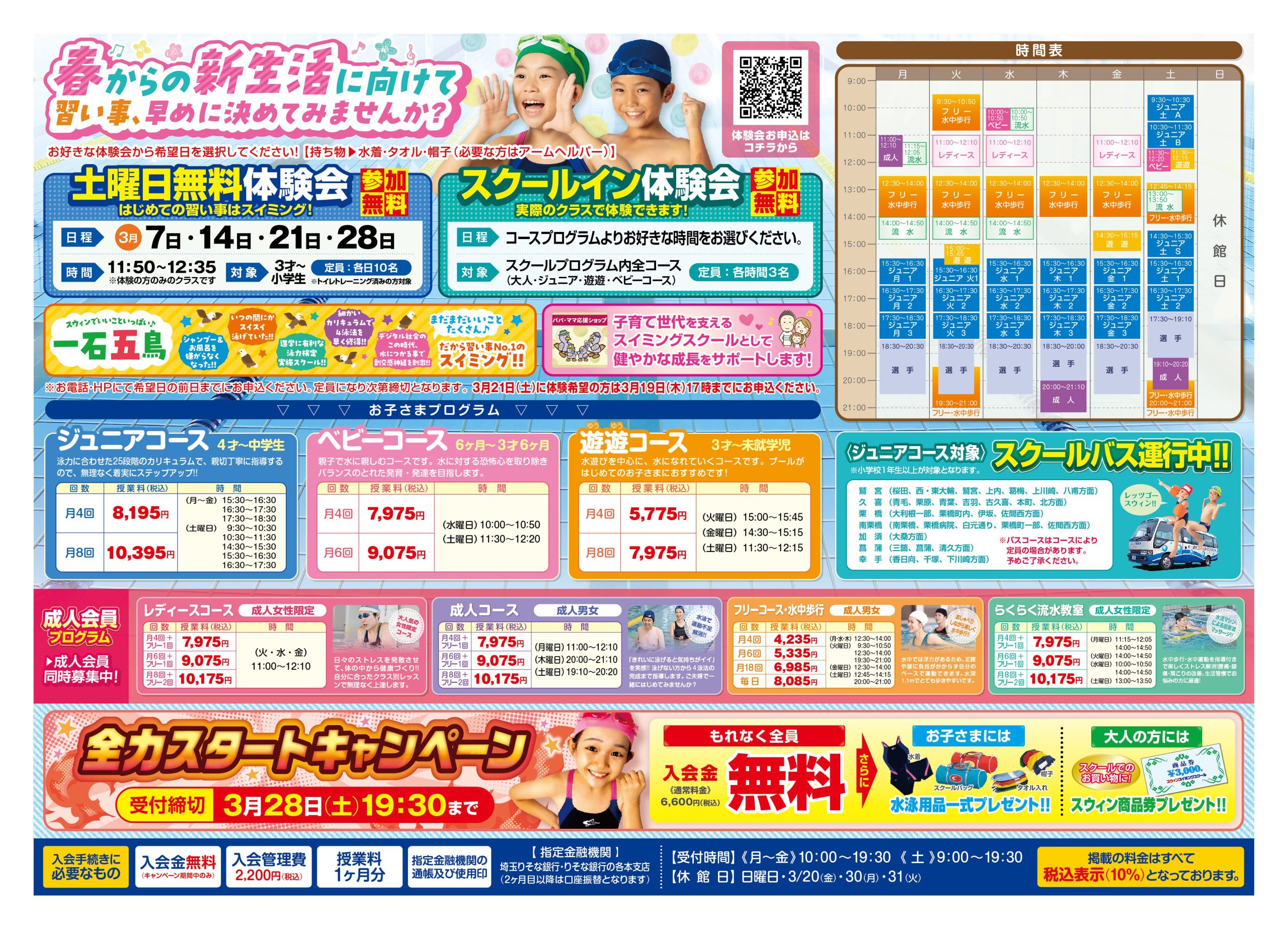 全力スタートキャンペーン 2026年3月4日 最終更新日時 : 2026年3月4日 コーチ鷲宮 無料体験会実施中!今すぐクリック! 無料体験申込フォームはこちらから 【キャンペーン内容】 もれなく全員入会金無料!!<通常6,600円(税込み)> お子さまには水泳用品一式プレゼント!!帽子・水着・スクールバッグ・タオル入れ! 大人・ベビーの方にはスウィン商品券プレゼント!!水着等スクールでのお買い物に! 【期間】 3/28(土) 19:30 まで